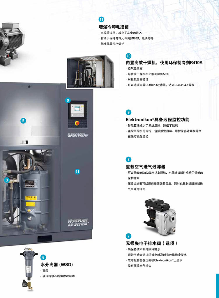 7 变频器优质高效,变频柜过压冷却设计,确保了机器 可以稳定运行在高达 50°C*。