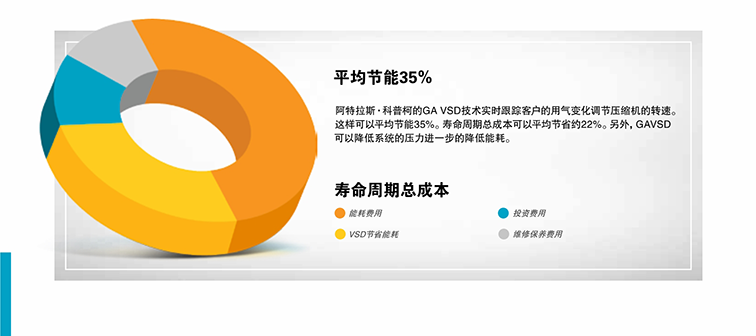 压缩机能耗占寿命周期总成本的80%以上,生产压缩空气的费用约占工厂全部电费40%以上。为了 降低能耗,阿特拉斯·科普柯开发出了变转速VSD空气压缩机。VSD技术不仅大量的节约的能源, 而且为子孙后代保护了环境。得益于在该技术上的不断投入,阿特拉斯·科普柯在市场上提供了最 大品类的VSD空气压缩机。