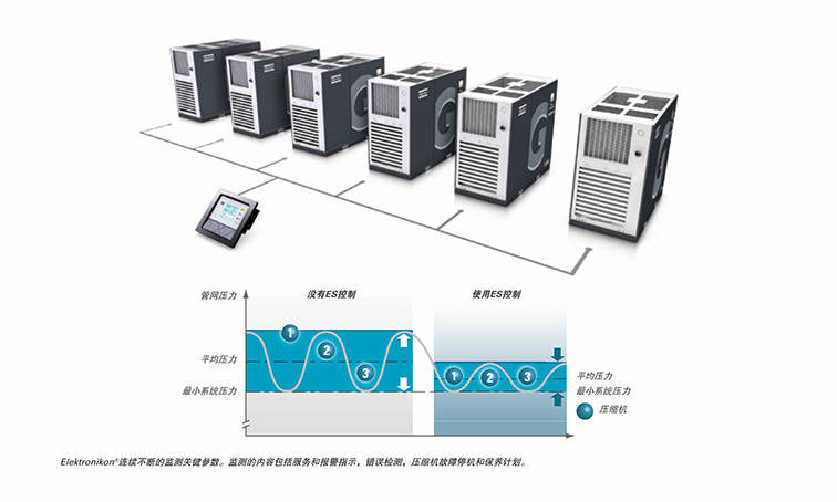 仅仅只需要一个license授权,就可以获得一个内置的压缩机集中控制器,可控制多至4台(ES4i)或者多至6台 (ES6i)压缩机,通过它可以降低系统的压力和减少能耗。